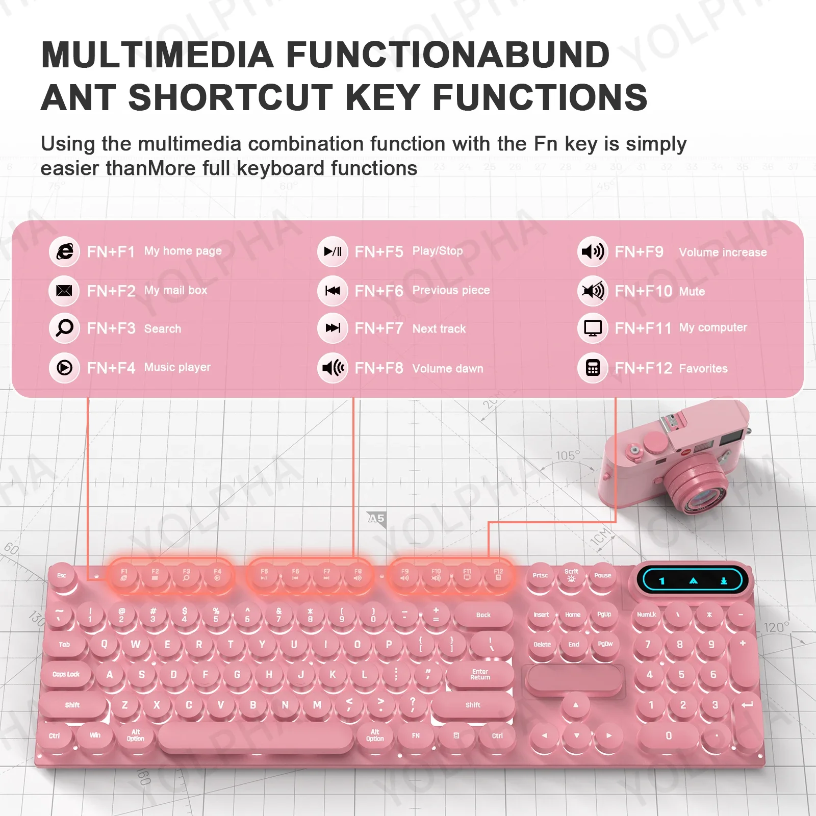 Pink keyboard- White backlight through keycaps, light can be turned off.