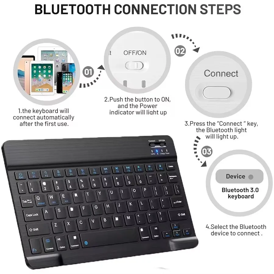 3: Turn on the Bluetooth -compatible switch of the device such as tablet/smartphone, search for Bluetooth -compatible device, the default Bluetooth -compatible name of the keyboard: Bluetooth- compatible 3.0 Keyboard.